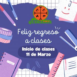 Con el objetivo de Promover la identidad Quimahuina, a través de la promoción y construcción de relaciones positivas desde el primer día de clases, los funcionarios de la comunidad Quimahuina prepara la bienvenida de nuestro/as estudiantes al establecimiento con gran entusiasmo y alegría. El día lunes 11 de marzo iniciaremos un nuevo año escolar recargados […]